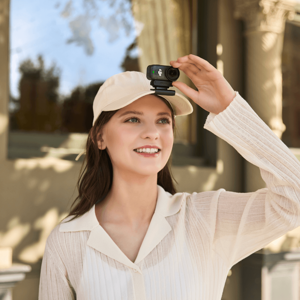 - Ngàm gắn nón Osmo Nano Magnetic Hat Clip: Gắn chắc camera vào vành mũ và dễ dàng điều chỉnh góc nghiêng. Nhẹ và gọn, thoải mái ghi lại cảnh quay góc nhìn thứ nhất mà không bị vướng.